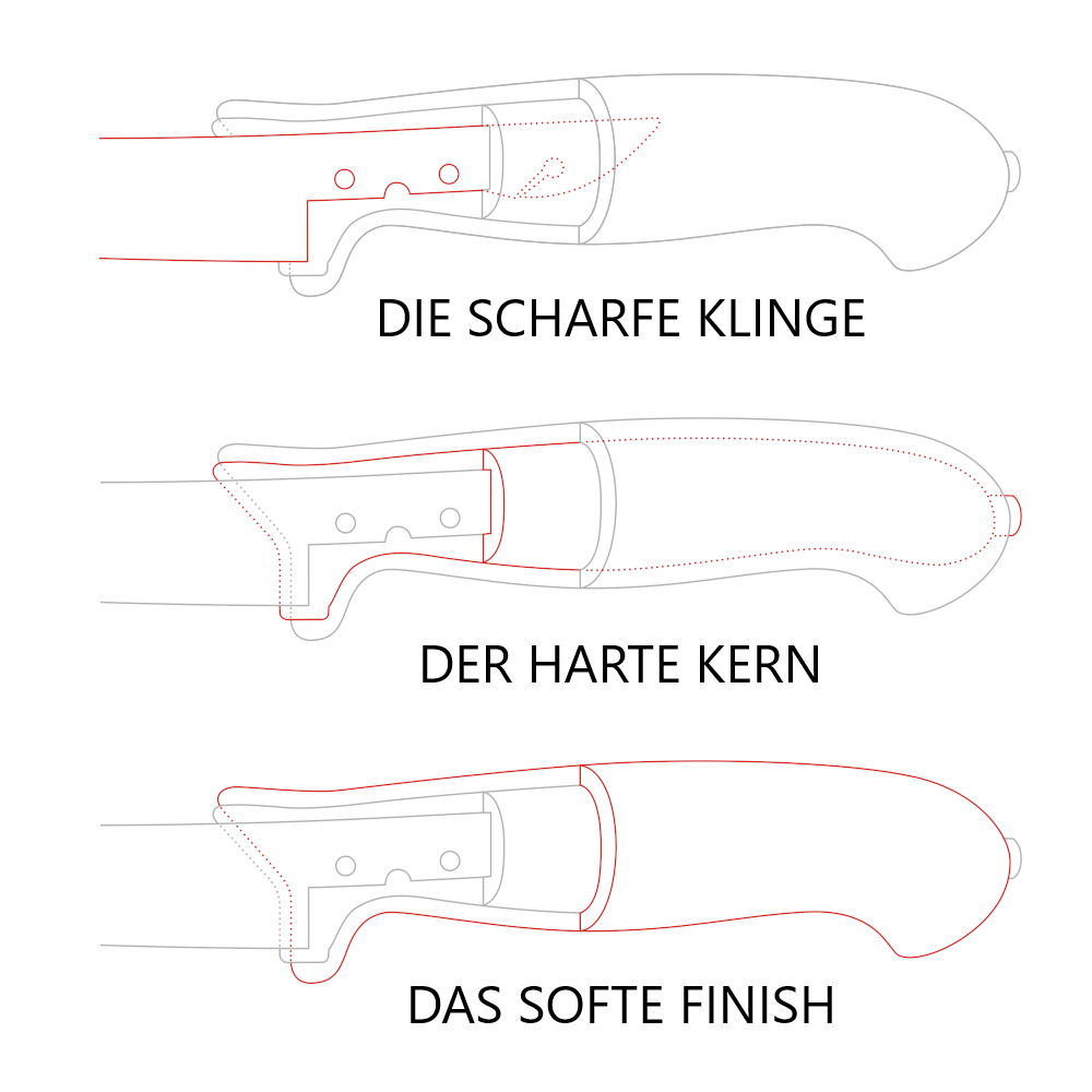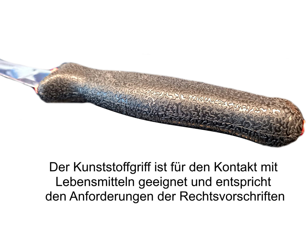 Der Griff: Das Highlight des Messers ist der ergonomisch gestaltete Griff. Mit einem stabilen inneren Kern und einer weichen äußeren Hülle aus Kunststoff bietet er maximale Handhabungssicherheit. Die spezielle Oberflächenstruktur sorgt für einen rutschfesten Halt und schont die Gelenke, was ein ermüdungsfreies Arbeiten ermöglicht.